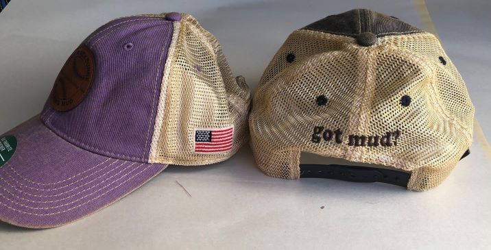 Distressed Baseball Caps Quantity in Basket: none Code: cap Price: $29.95 Shipping Weight: 0.40 pounds Lavender Blue Quantity: "Distressed" Baseball Caps. Blue or Lavender. Adjustable. Embroidered "Got Mud" on back with leather logo on front.